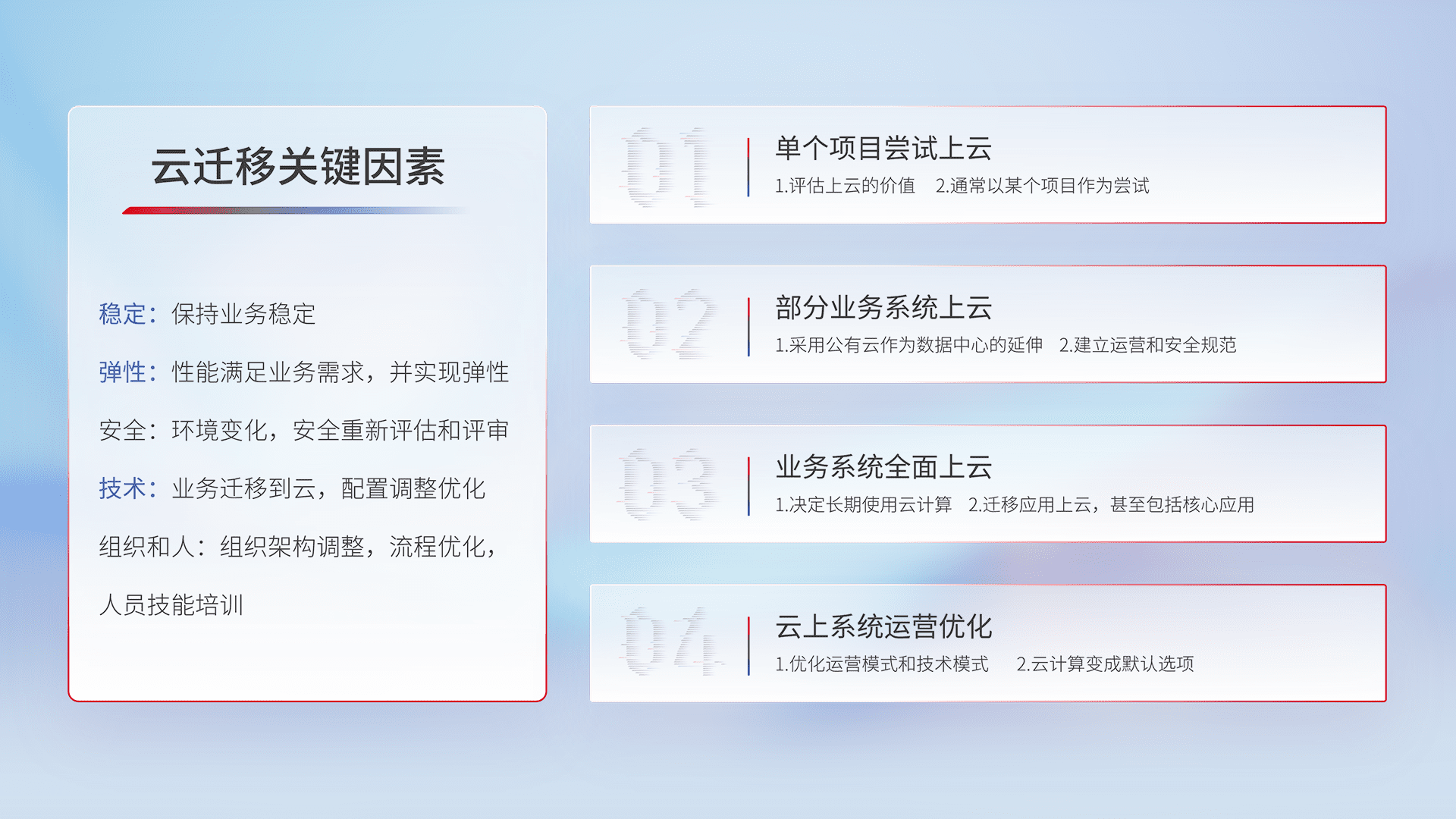 结合实际业务,,,从规划设计、、云平台选型、、、、云原生改造、、、数据迁移、、、集成交付,,,,迁移全过程为客户识别最佳上云路径,,,,做好风险识别管理,,,,设计网络架构、、、、身份权限、、、、安全审计合规、、操作审计、、、日志审计、、、监控告警策略、、多站点容灾设计等,,对云上基础设施进行整体规划,,,提升IT治理水平,,,,以满足弹性、、、高可用、、、、高性能的需求。。