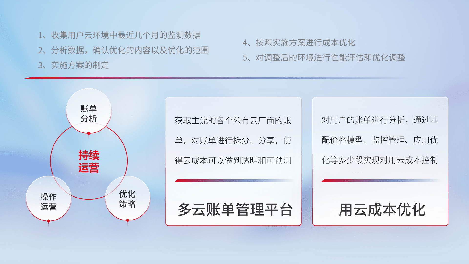 通过多云纳管,,,以统一的资源数据模型把客户的云资源进行抽象和封装,,进而实现对多云资源的统一操作,,,保障云资源管理的可靠性、、稳定性与可用性。。。。量身定制化运维内容,,,,配置、、开发运维、、、补丁管理、、、、备份、、监控、、、认证和访问管理、、审计和日常巡检等,,保障在用云过程中的可靠度,,稳定度以及高可用率。。。