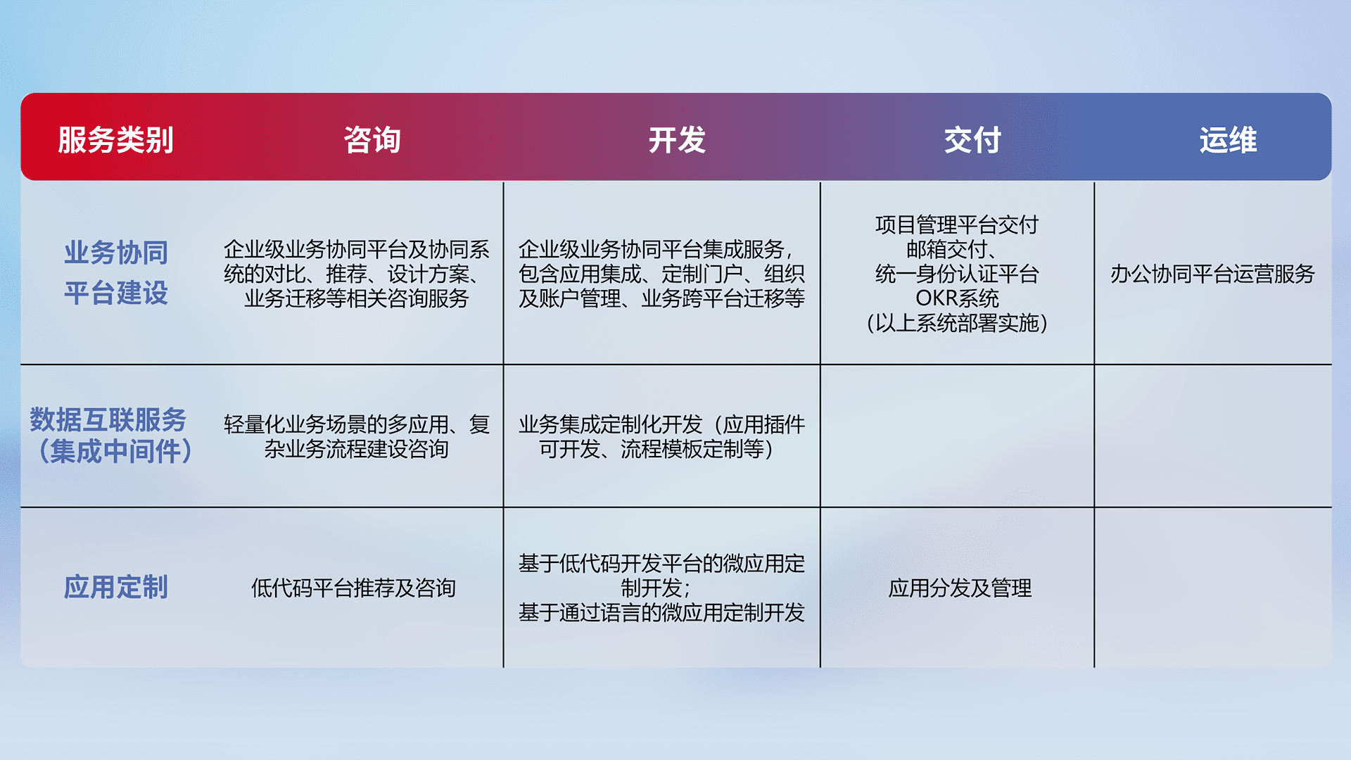 针对钉钉、、、企微、、IDaas等平台级产品提供产品的规划、、、方案、、、交付、、定制化开发等服务,,,,实现如统一协同办公、、、、智能客户服务、、混合会议管理、、、、智能数据查询、、、、等业务场景,,实现数字化转型。。。